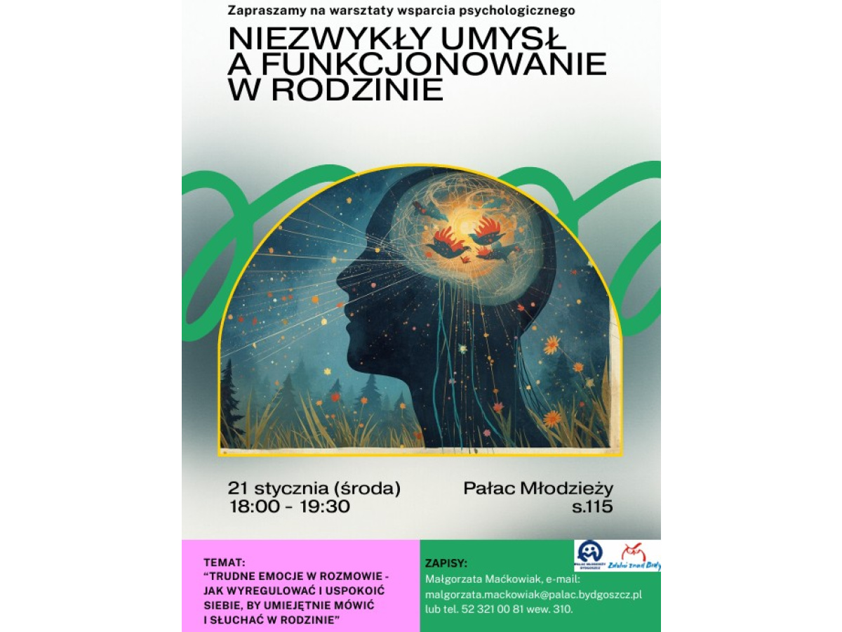 Temat: „Trudne emocje w rozmowie - jak wyregulować i uspokoić siebie, by umiejętnie mówić i słuchać w rodzinie". Termin: 21 stycznia 2026 r. (środa). Godzina: 18:00–19:30. Miejsce: sala 115, Pałac Młodzieży w Bydgoszczy